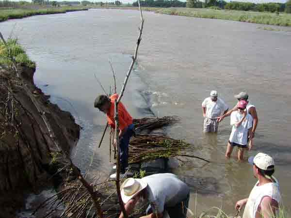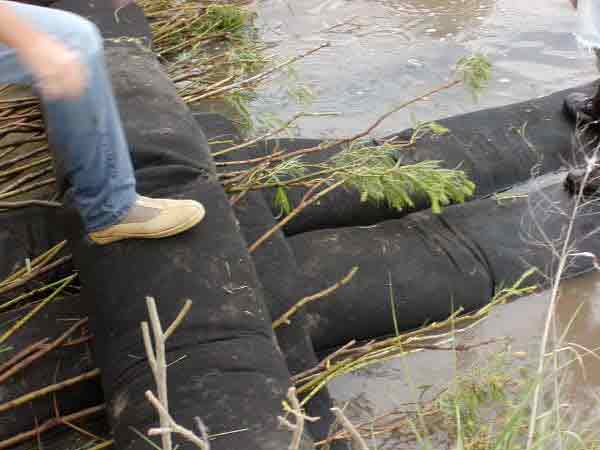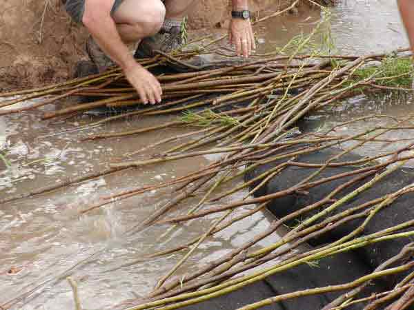 The keyway locations were further reinforced by pole planting, brushlayering, and geoberm bags mounted parallel to flow line. John